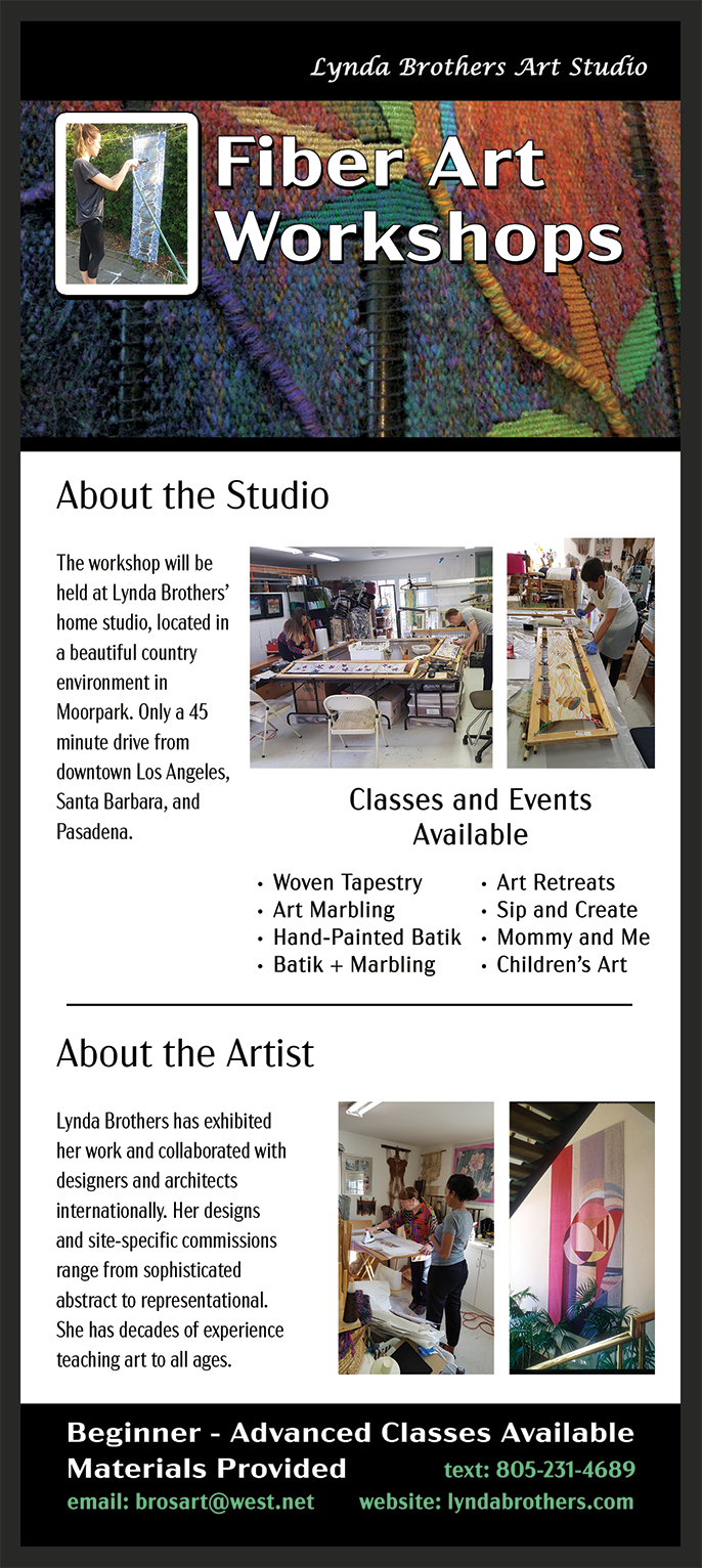 “My daughter and I take weaving classes with Lynda Brothers at her well resourced studio. We are enjoying our classes because she is a very creative, patient and thorough teacher. She tailors her teaching to the abilities of each student. She has a wealth of knowledge regarding textile art and the resources to have you choose just about anything for to make a project how you would like it done. Lynda offers many classes like marbling, batik, weaving, felting, and more.” Isabelle Becker 09/04/2023