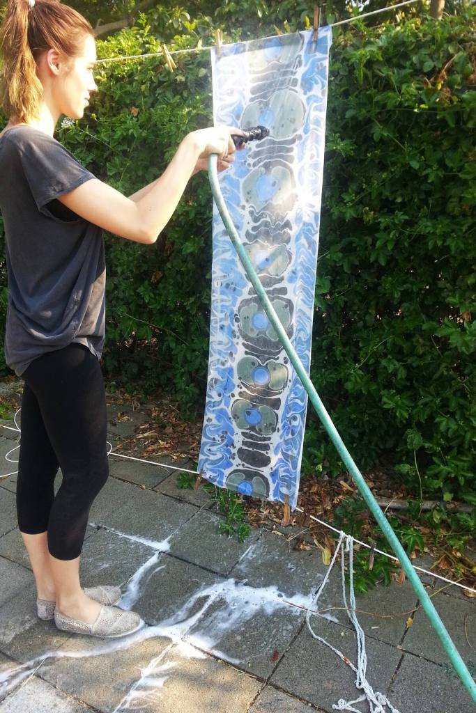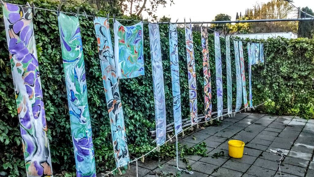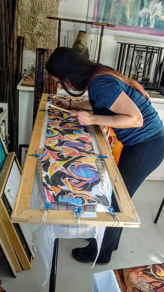 In this two day workshop we will work with the techniques of batik design and marbling on fabric in a totally unique and individually creative way. The artistic combination of the two methods adds depth, movement, and a textured look to any design, abstract or realistic, and can be applied to a variety of fabrics. The batik designs will involve Indonesian waxing and dying techniques on silk and cotton, which will be steamed to set the dyes. The marbling involves floating thin paints on a thickened water base which are then manipulated into patterns or swirls and printed onto the surface of the fabric. There will be a maximum of 6 students with several marbling baths available. Future classes will be offered for more advanced techniques.