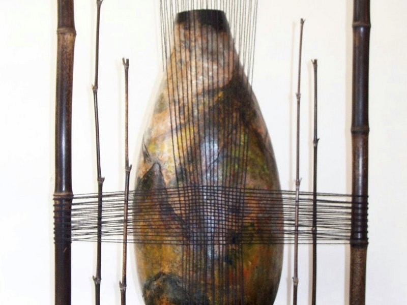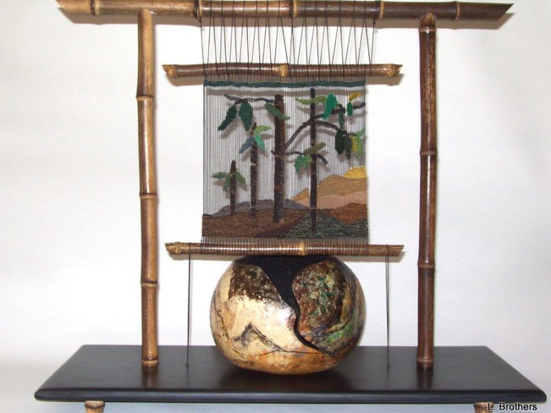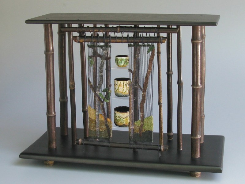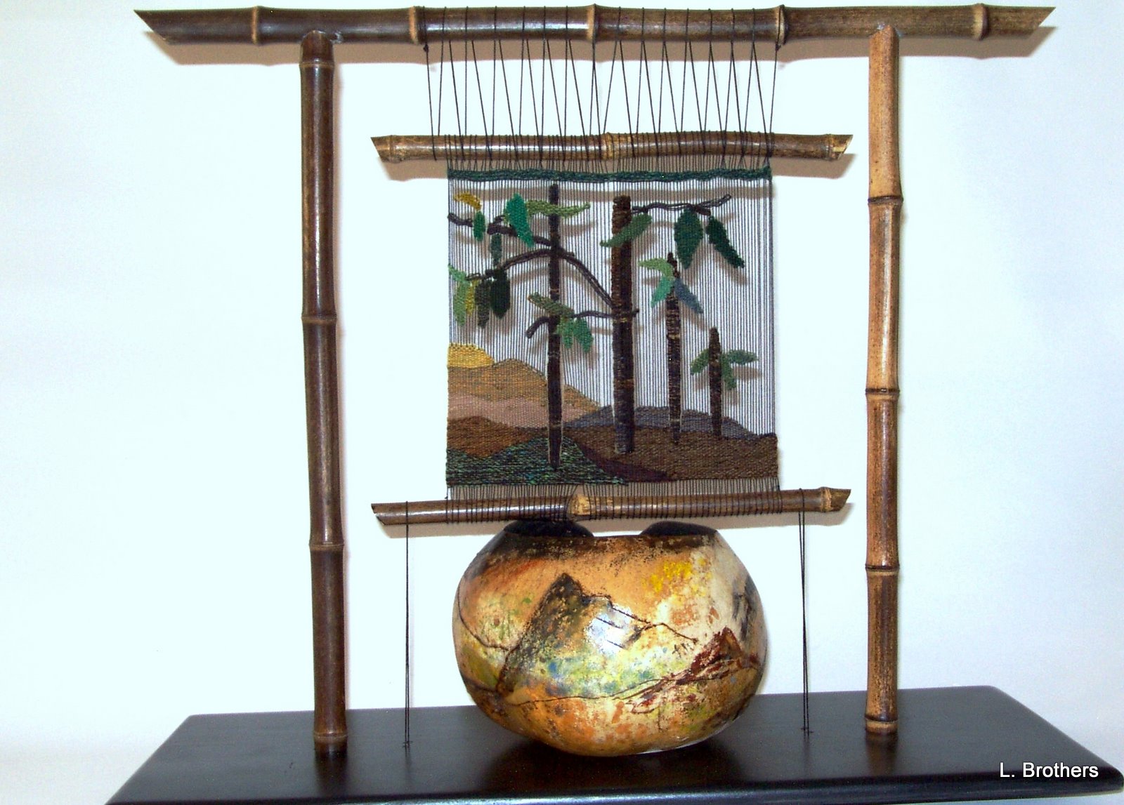 EAST meets west in the bamboo garden Sculptural Art, Tapestry Woven wool and hand dyed bamboo yarns, painted and carved gourd with pyrography. Winner of Handweaver’s Guild of America “Showcase”. Size: 23″ W x 27″ H x 11″D Share this: Click to share on X (Opens in new window) X Click to share on Facebook (Opens in new window) Facebook Like Loading...
