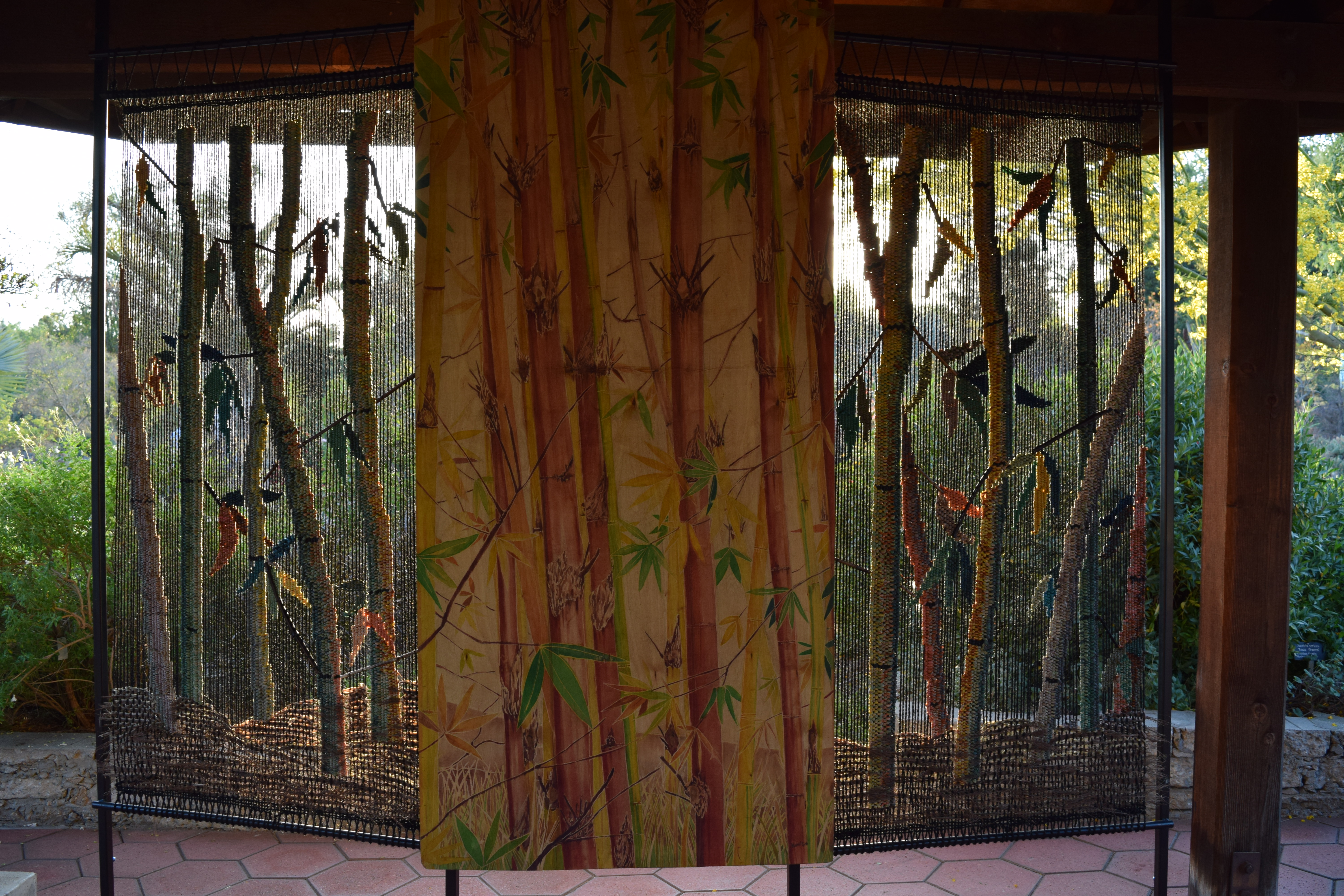 - two woven screens – made with palm leaf rope, dyed raffia grass, and bamboo from the artist’s garden. Weavings are 38″ Wide x 8 Feet High, base 18″ x 18″, total depth 18″ with base.